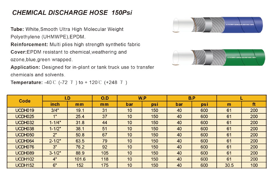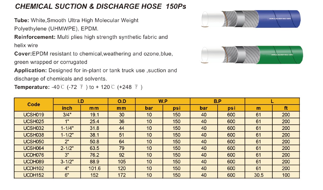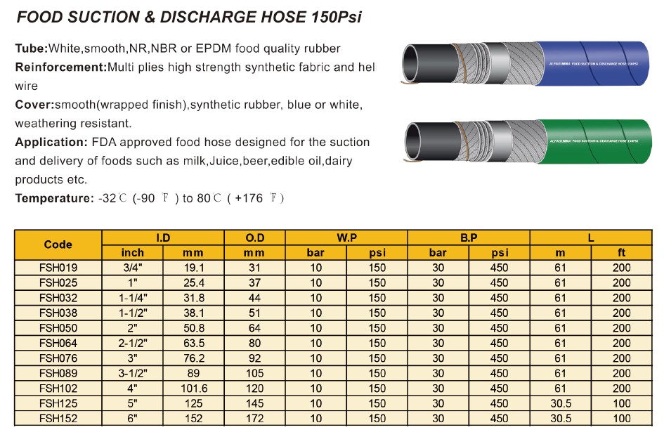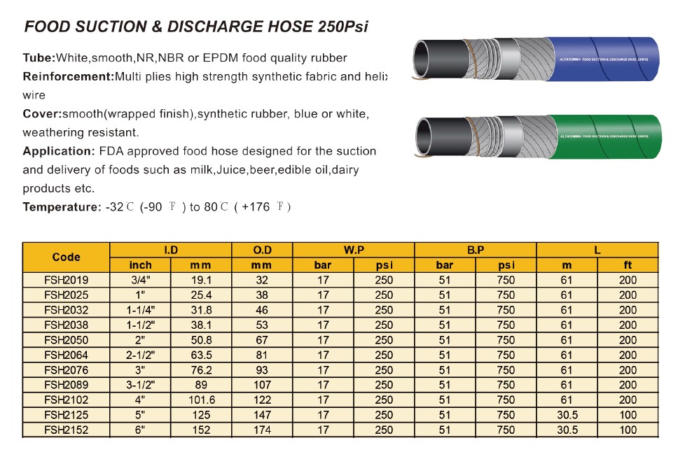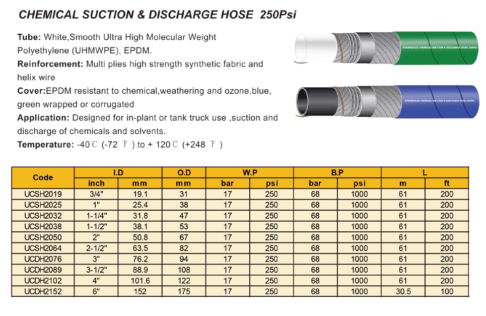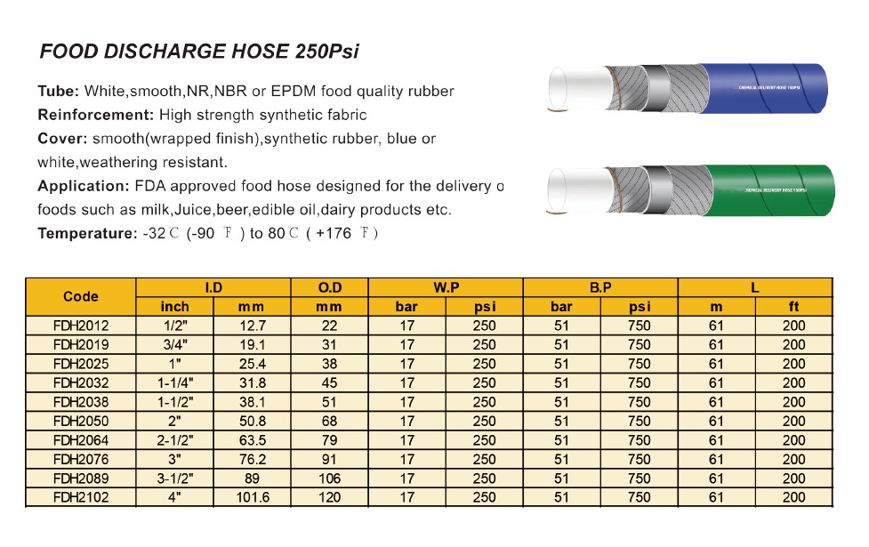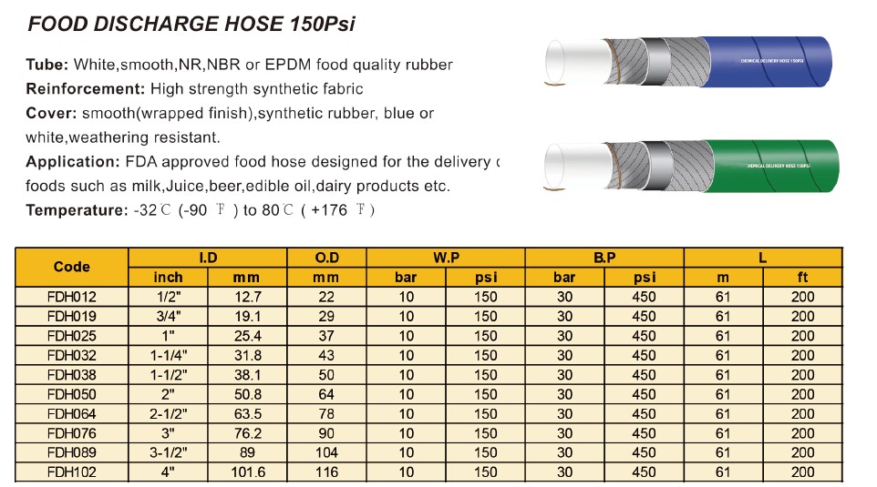 Chemical Food Hose ensures safe and reliable handling of food and chemical products. We offer high-quality hoses rated 150–250 PSI, ideal for industrial and food-grade use.